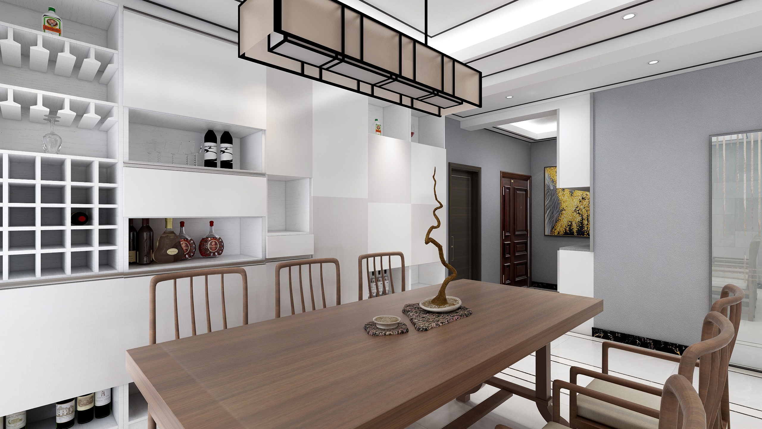 墻面藝術性的設計,體現整體的格調,提升了整體高級的氣質,搭配紅酒也毫不違和。木制桌椅體現了中式風格和現代風格相融合,原木色即質感又增添了整個房間的溫馨氛圍。在這樣的餐廳內吃飯,似乎食欲也變得好了。大人在旁邊添飯夾菜,老人和孩子吃的大快朵頤,真是一副其樂融融的景象。