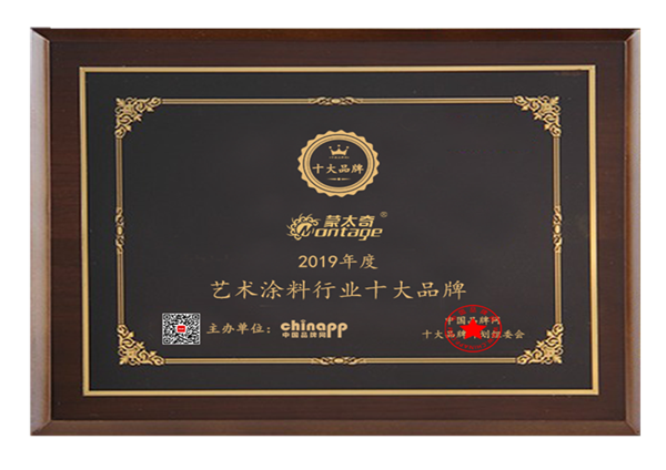 序:蒙太奇品牌于2019年參加中國品牌網舉辦的2019藝術涂料行業十大品牌評選,在藝術涂料眾多參選品牌中脫穎而出,榮獲藝術涂料行業十大品牌獎項。